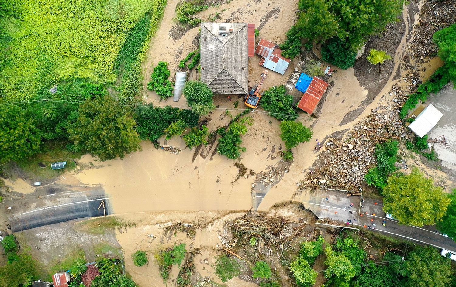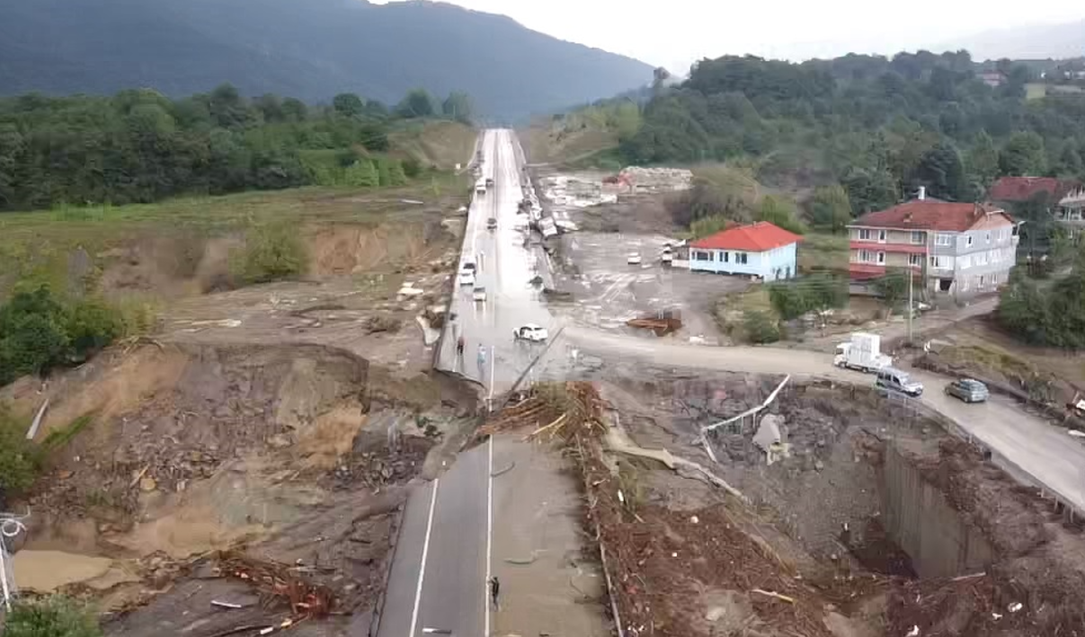 Bartın'da şiddetli yağışa bağlı oluşan sel ile heyelanın yol açtığı hasar drone ile görüntülendi. Bartın Karabük yolu Bahçecik mevkisinde bir köprü sel nedeniyle çöktü.