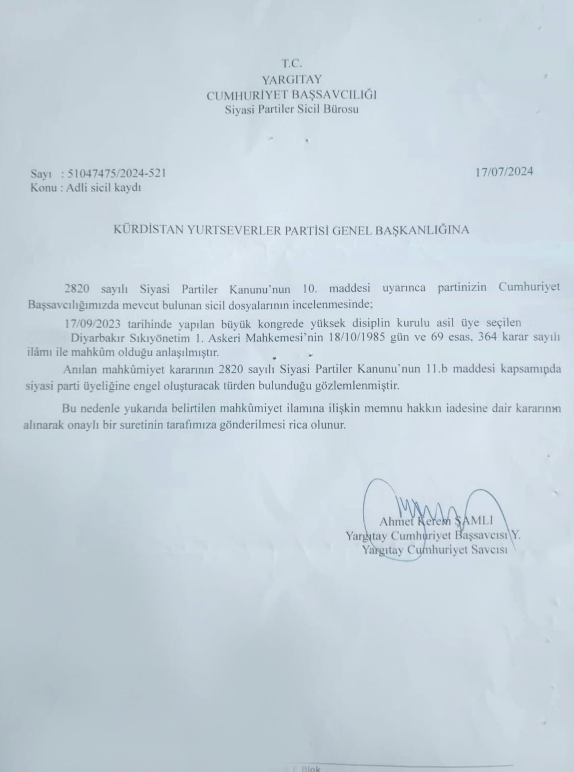 16 Mayıs 2024 tarihinde Yargıtay Cumhuriyet Başsavcısı’nin değişmesinden sonra, Yargıtay’ın yeni başsavcısı Kürdistan Yurtseverler Partisi adına bize resmi bir yazı gönderdi. Bu da partimizin isim değişikliğinin resmi olarak kabul edildiği anlamına gelmektedir.