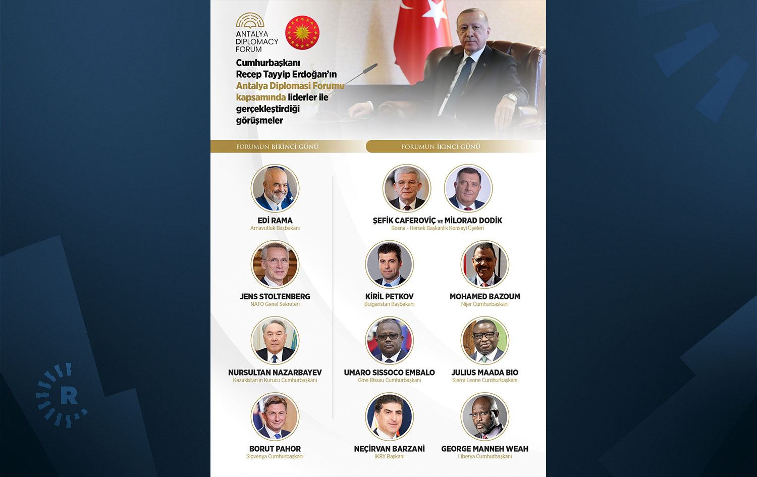 Erbil (Rûdaw) - Türkiye Cumhurbaşkanlığı, Cumhurbaşkanı Recep Tayyip Erdoğan'ın Antalya Diplomasi Forumu (ADF) kapsamında bir araya geldiği liderlerin fotoğraflarını yayınladı.