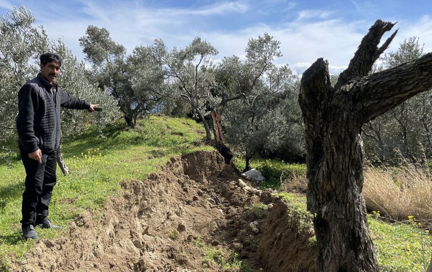 Prof. Dr. Sözbilir, Hatay'ın Samandağı ilçesi Çubuklu köyünde ikiye bölünerek bir parçası 10 metre yer değiştiren zeytin ağacında incelemelerde bulundu.