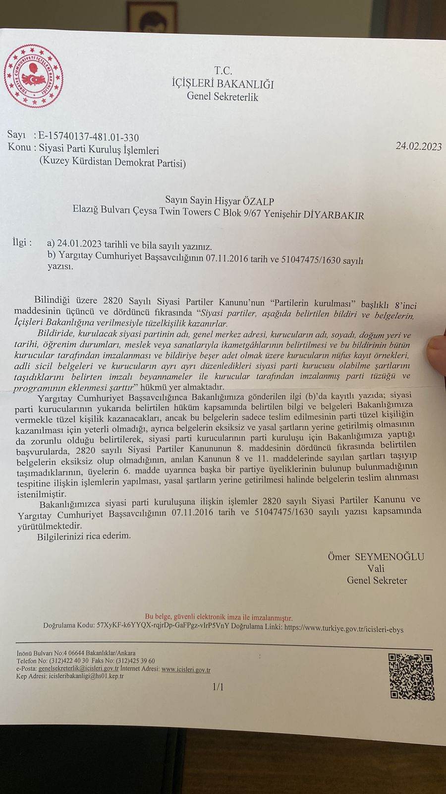 PDK Bakur Sözcüsü Hişyar Özalp, bakanlığın kendilerine gönderdiği cevapta Yargıtay Cumhuriyet Başsavcılığı’nın parti kuruluşu ile ilgili usulleri hatırlattığını belirterek, “Bunu yaparken ‘alındı belgesinin’ verilmemesiyle ilgili somut bir şey söylememekte adeta incelemenin devam ettiğini örtük biçimde belirtmiştir. Bu cevap yazısı başlı başına bir hukuk skandalıdır. Birincisi örgütlenme hakkı uluslararası sözleşmeler, anayasa ve kanunlarla teminat altına alınmış temel bir insan hakkıdır. Bu hakkı idarenin yazışmaları ortadan kaldıramaz, sınır getiremez veya yeni bir usul getiremez” dedi.