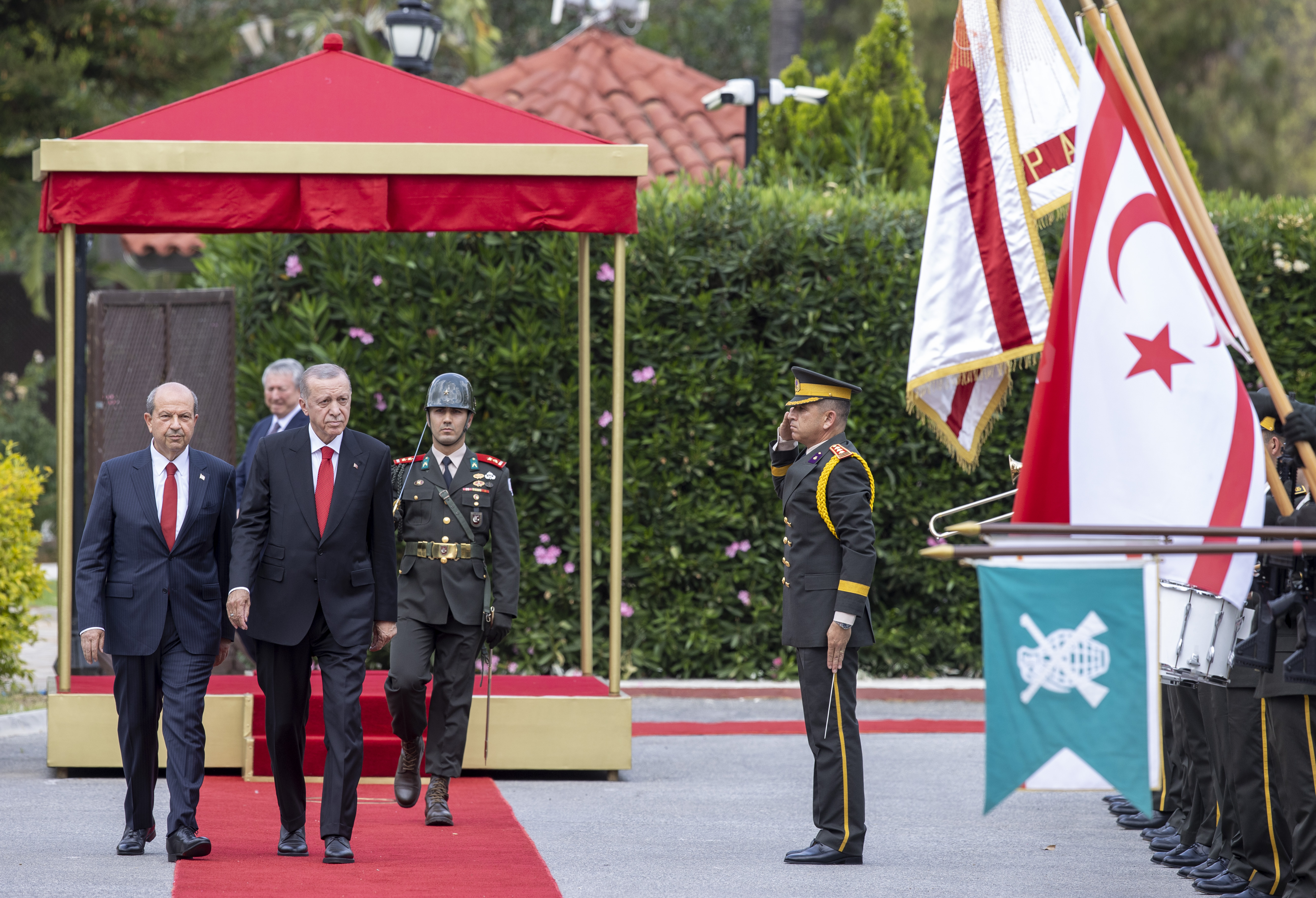 Erdoğan, resmi ziyaret için gittiği Lefkoşa'da, Kuzey Kıbrıs Cumhurbaşkanı Ersin Tatar tarafından resmi törenle karşılandı.