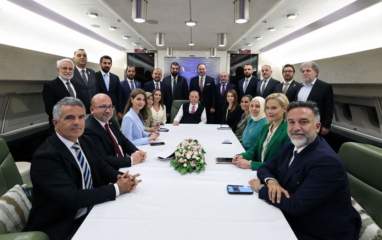 Türkiye Cumhurbaşkanı Recep Tayyip Erdoğan, NATO Devlet ve Hükümet Başkanları Zirvesi için gittiği ABD'nin başkenti Washington'dan dönüş yolunda uçakta gazetecilerin sorularını yanıtladı.