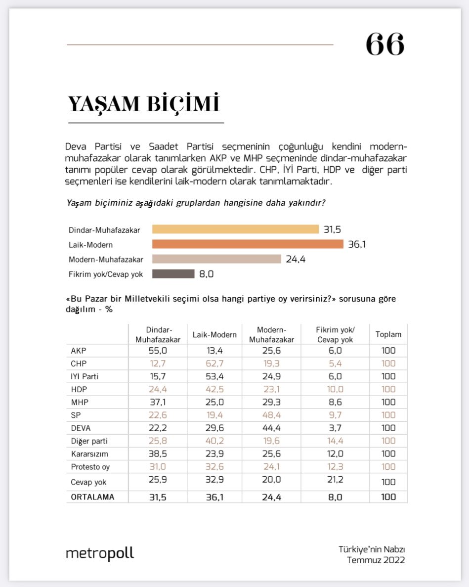Sencar ayrıca “yaşam biçimi” üzerine yaptıkları araştırmada da yüzde 31,5’in kendini “dindar-muhafazakar”, yüzde 36,1’inin kendini “modern-laik” ve 24,4’ünün de kendini “modern muhafazakar” olarak nitelendirdiğini kaydetti.
