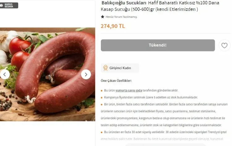İnternetten 500 gramı 270 liraya satılan sucuk için “Balıkçıoğlu Sucukları Hafif Baharatlı Katkısız %100 Dana Kasap Sucuğu” notu düşüldü.