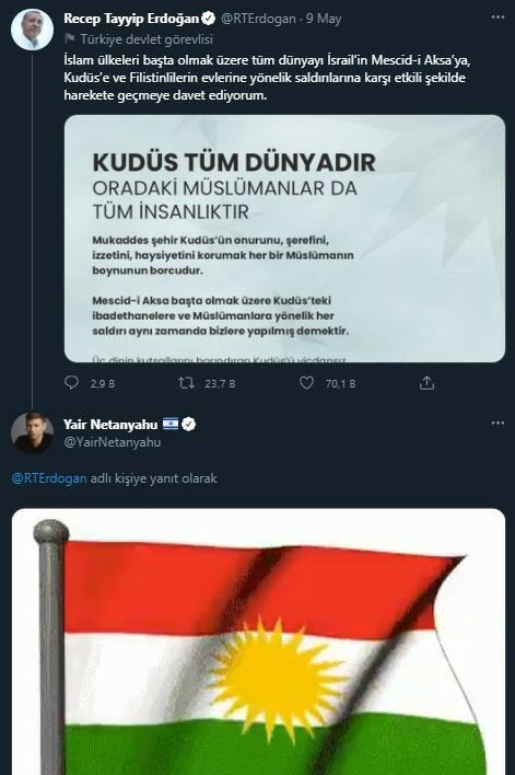İsrail Başbakanı Binyamin Netanyauhu’nun oğlu Yair Netanyahu, Türkiye Cumhurbaşkanı Recep Tayyip Erdoğan’ın Filistin’e ilişkin Twitter üzerinden yaptığı bir açıklamanın altına Kürdistan Bayrağı görseli ile yorum yaptı.