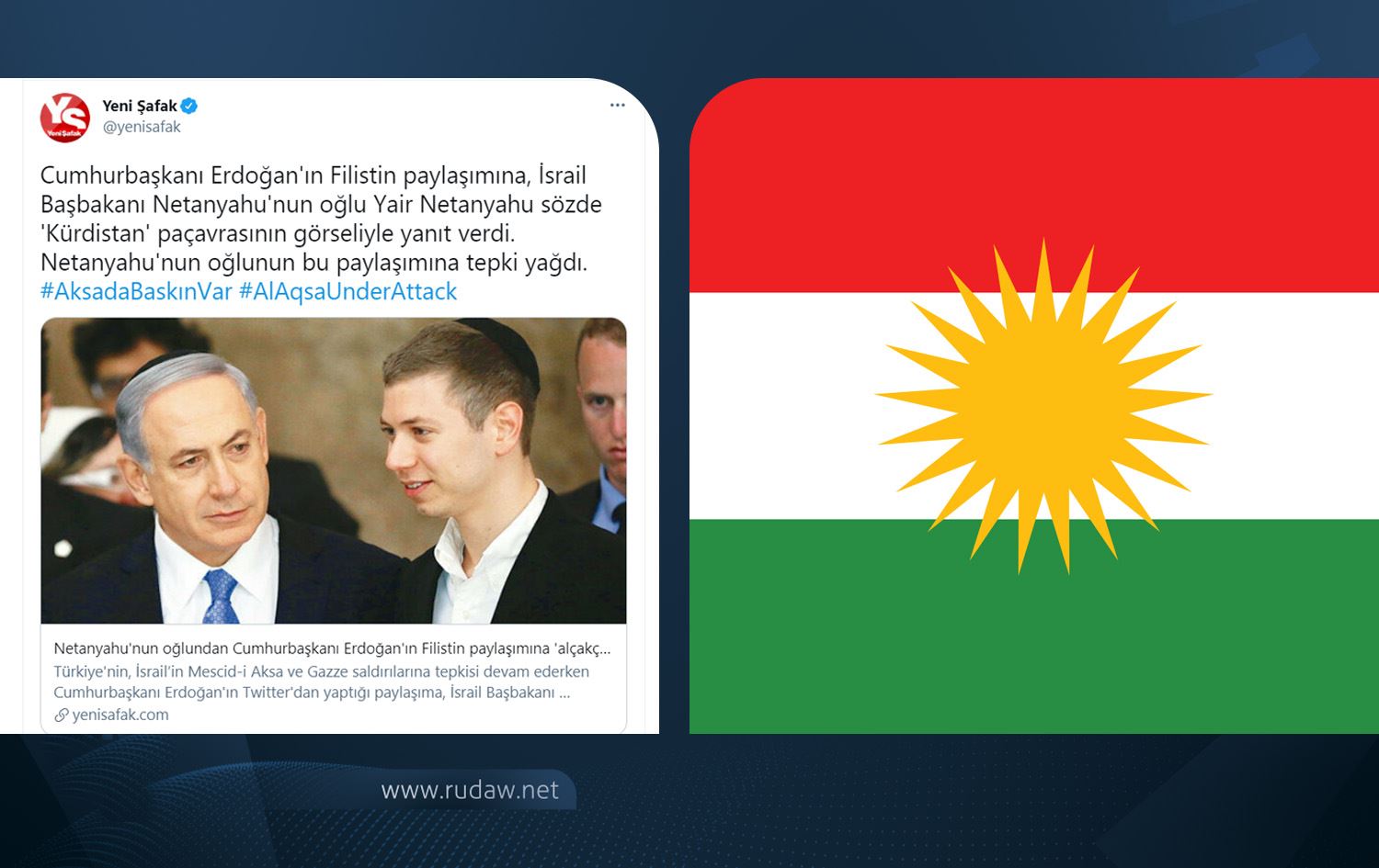 Konu hakkında “Netanyahu'nun oğlundan Cumhurbaşkanı Erdoğan'ın Filistin paylaşımına 'alçakça' cevap” başlığıyla haber yapan Yeni Şafak gazetesi ise, haberin içerisinde Kürtler için en kutsal sembol ve değerlerden biri olan Kürdistan Bayrağına hakaret içerin ifadeler kullandı.