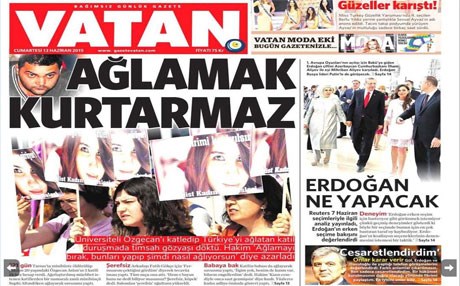Vatan gazetesi, “Ağlamak kurtarmaz” başlıklı manşet haberinde, Özgecan Aslan davasının ilk duruşmasını okurlarına duyurdu.