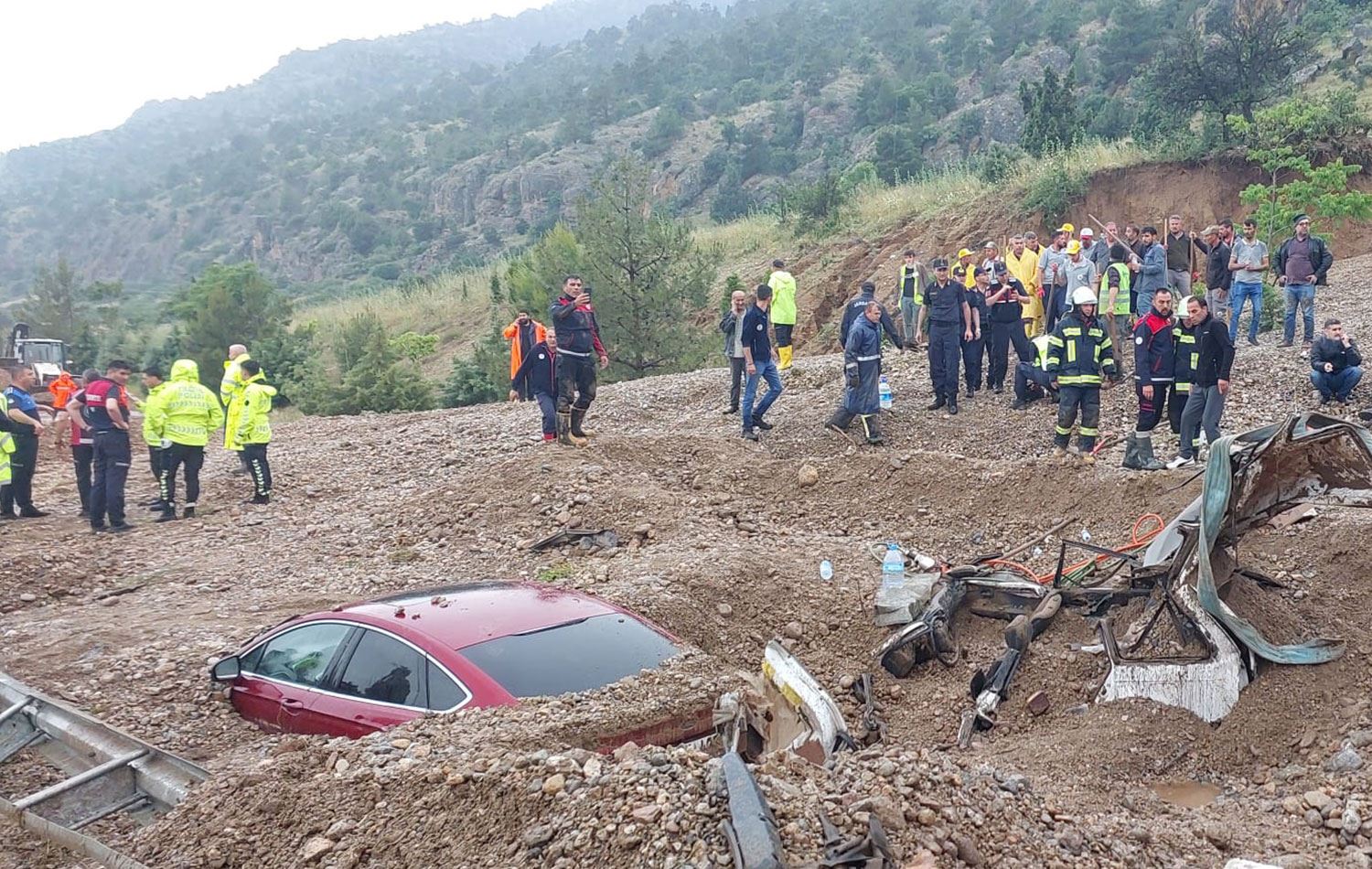 Heyelan nedeniyle kara yolundan geçen 2 araç toprak altında kaldı.