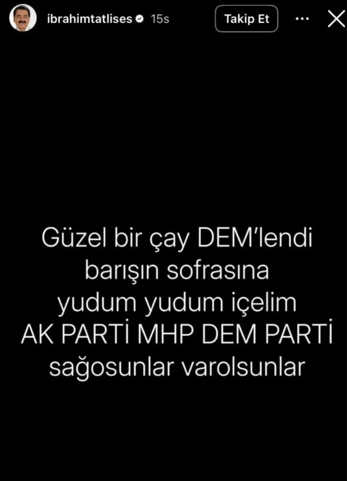 Atılan adımlar ve yapılan açıklamaların ardından sanatçı İbrahim Tatlıses de sosyal medya hesabından; "Güzel bir çay DEM'lendi barışın sofrasına yudum yudum içelim. AK Parti, MHP, DEM Parti sağ olsunlar, var olsunlar" mesajını yayımladı.