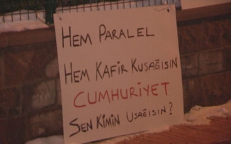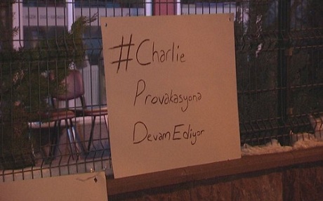 Ankara’da, kimliği belirsiz bir grup, Cumhuriyet gazetesinin bahçe duvarına, “Charlie provokasyona devam” yazılı iki pankart bırakırken, çevrede güvenlik önlemleri alındı.