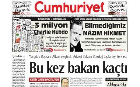 Haber Merkezi - Fransız mizah dergisi Charlie Hebdo'nun özel sayısından dört sayfalık bir seçki yayınlayan Cumhuriyet gazetesi, polisin günün ilk saatlerinde matbaa çıkışında dağıtım kamyonlarını durdurduğunu duyurdu.