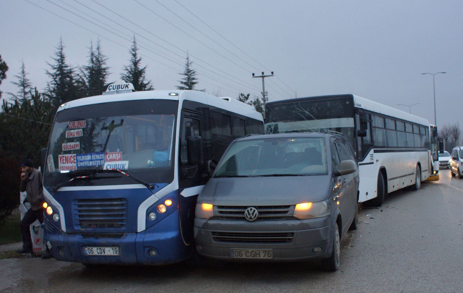 Çubuk-Ankara kara yolunun Güldarpı Mahallesi mevkiinde iki minibüs ve işçi taşıyan iki otobüsün karıştığı zincirleme trafik kazası meydana geldi.