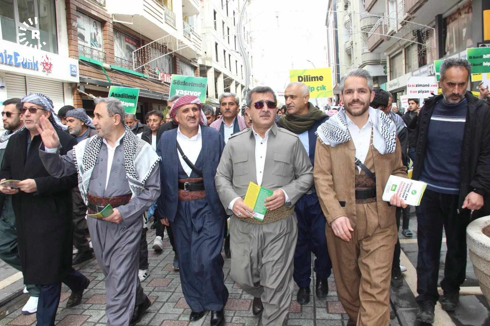 Huzur Camii'nde kılınan Cuma namazının ardından başlayan yürüyüşe katılan vatandaşlar, Kürtçe pankartlar taşıdı.