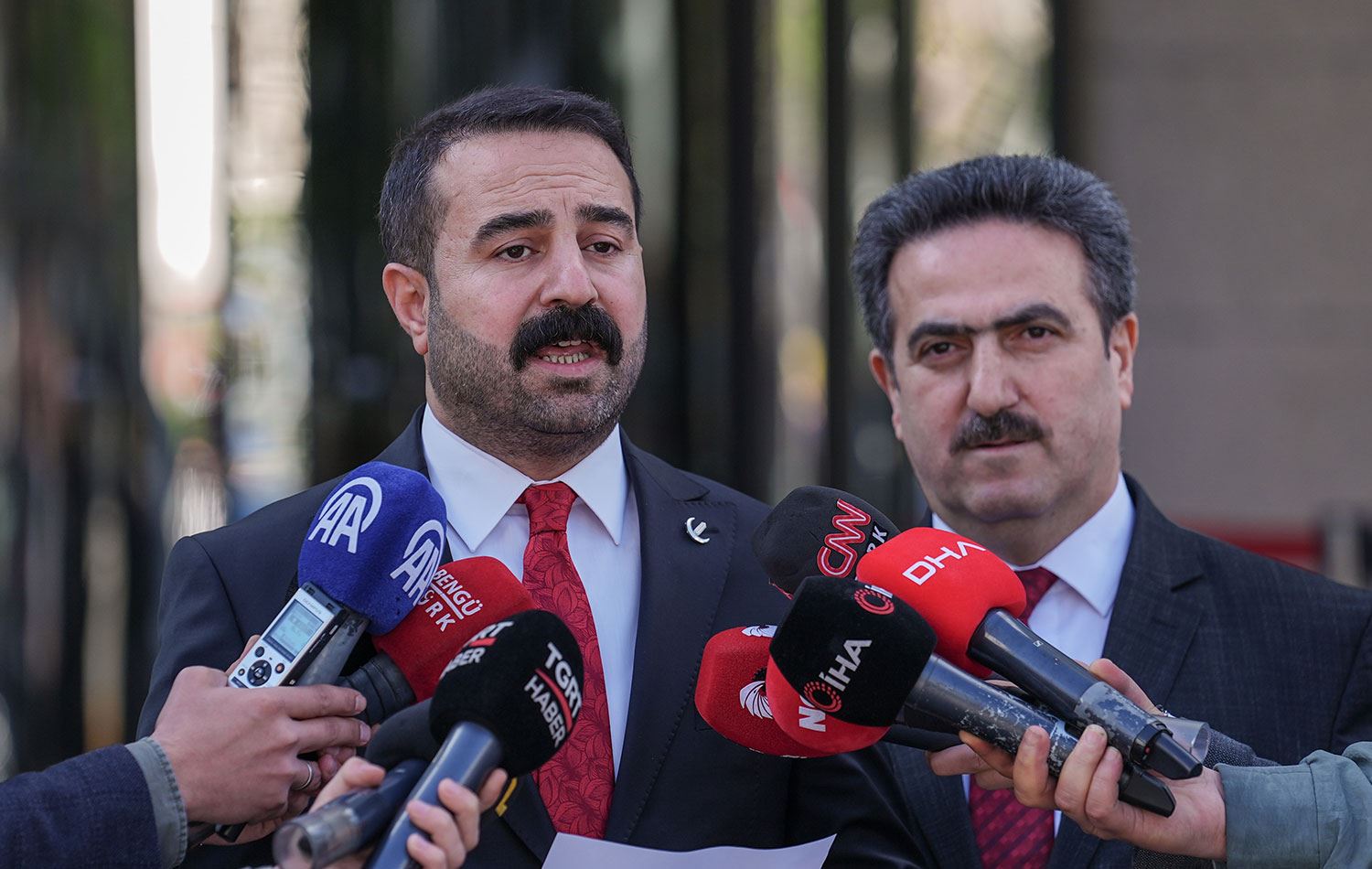 YRP'nin Genel Merkez Seçim Koordinasyon Merkezi Başkanı Mahmut Tandoğan (sağda) ile belediye başkan adayı Hasan İzol (solda), itiraz dilekçelerini sunmalarının ardından açıklama yaptı. / AA