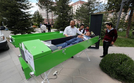 Klimalı tabutu merak eden Anıl Uygun isimli genç ise, tabutun içine girdi. "Bizim köyümüzde klimalı tabut var" diyen Uygun, "Güzel bir şey. Ölü bu tabutun içinde çok rahat eder. Ben çok beğendim" ifadesini kullandı.