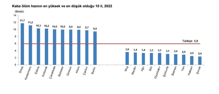 Ayrıca Türkiye'de kaynaklı ölümlerin en az olduğu iller de listelendi. Bin kişi başına düşen ölüm sayısını ifade eden kaba ölüm hızının en yüksek olduğu il, 2022 yılında binde 11,7 ile Sinop, kaba ölüm hızının en düşük olduğu il ise binde 2,4 ile Şırnak oldu.