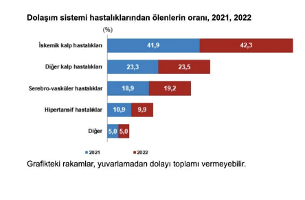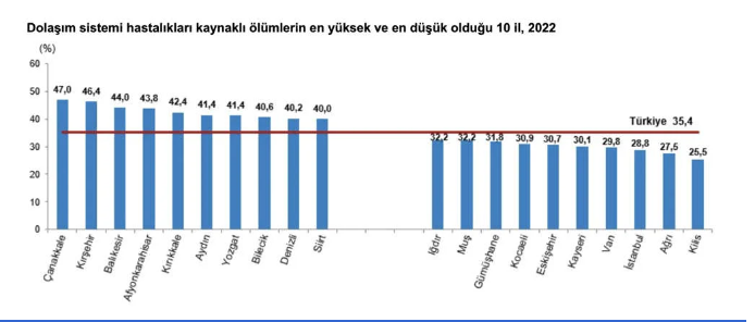Dolaşım sistemi hastalıklarından kaynaklı ölümler alt ölüm nedenlerine göre incelendiğinde, ölenlerin %42,3'ünün iskemik kalp hastalıklarından, %23,5'inin diğer kalp hastalıklarından, %19,2'sinin serebro-vasküler hastalıklardan öldüğü görüldü. Dolaşım sistemi hastalıklarından ölenler illere göre incelendiğinde, 2022 yılında dolaşım sistemi hastalıklarına bağlı ölüm oranının en yüksek olduğu il %47,0 ile Çanakkale oldu. Bu ili %46,4 ile Kırşehir, %44,0 ile Balıkesir, %43,8 ile Afyonkarahisar izledi.