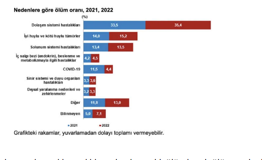 Ölüm nedenleri arasında dolaşım sistemi kaynaklı hastalıklar ilk sırada yer aldı. Bu ölüm nedenini %15,2 ile iyi huylu ve kötü huylu tümörler, %13,5 ile solunum sistemi hastalıkları izledi.