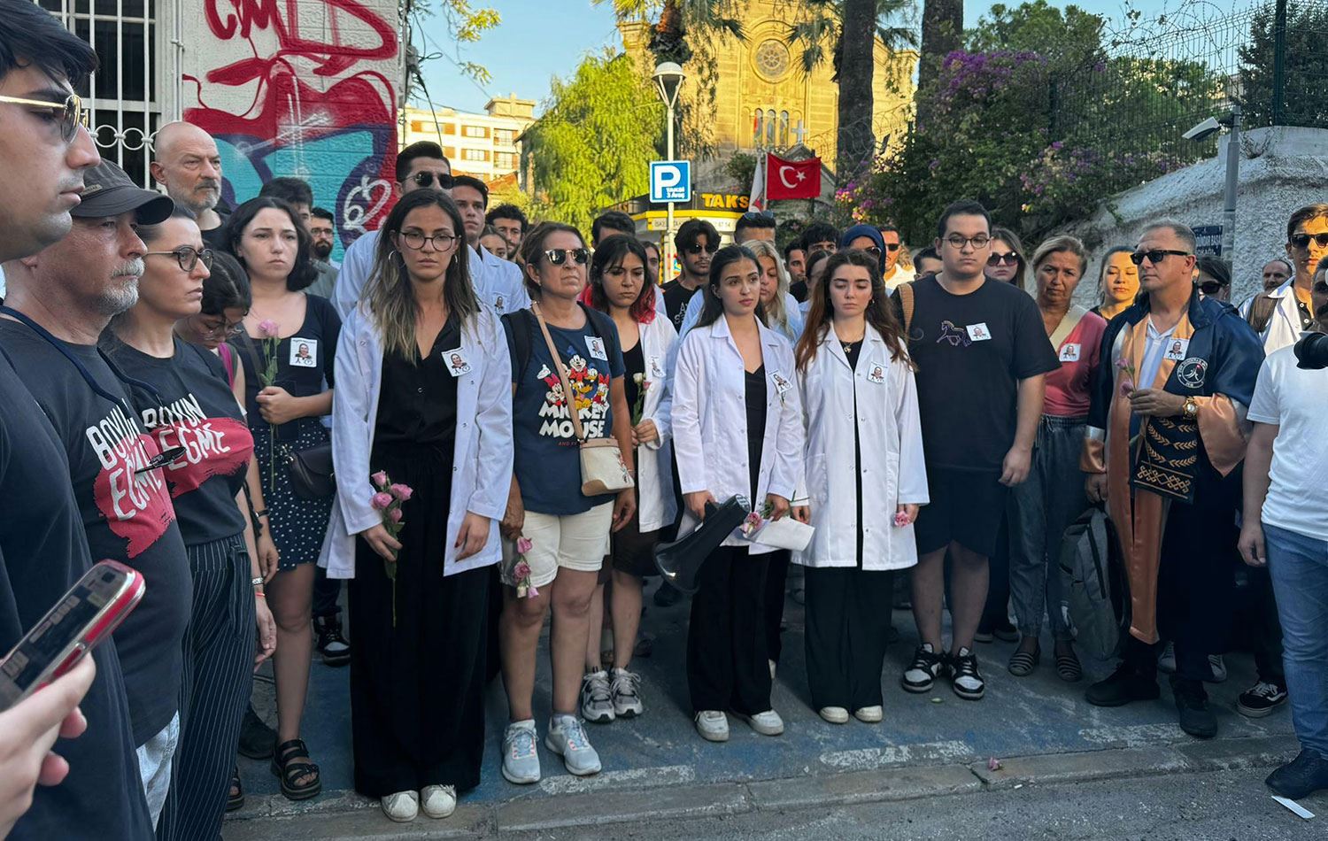 Olayın gerçekleştiği sokakta toplanan İzmir Demokrasi Üniversitesi Tıp Fakültesi öğrencileri, üzerlerinde beyaz önlükleriyle Özge Ceren Deniz anısına karanfil bıraktı, saygı duruşunda bulundu.