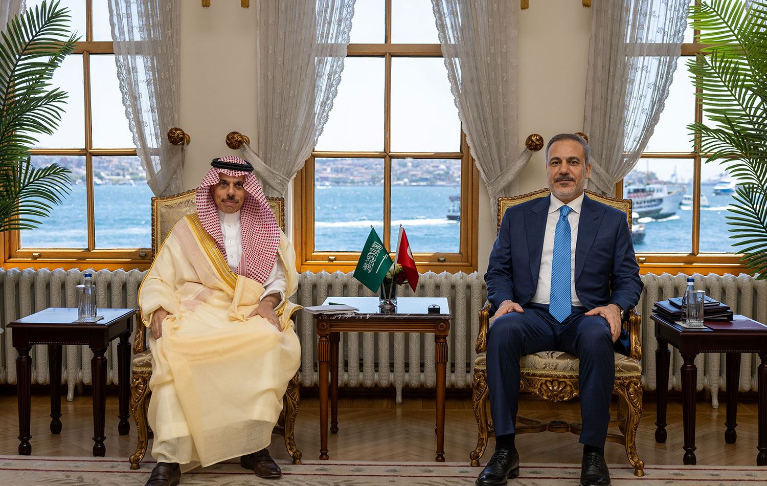Türkiye Dışişleri Bakanı Hakan Fidan (sağda), Suudi Arabistan Dışişleri Bakanı Faisal bin Farhan Al-Saud (solda) ile İstanbul Dolmabahçe çalışma ofisinde bir araya geldi. / AA