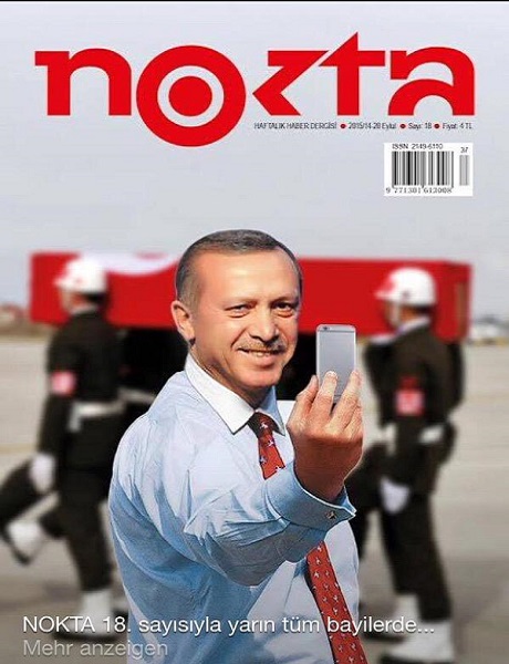 Nokta dergisinin son sayısında Cumhurbaşkanı Recep Tayyip Erdoğan, hayatını kaybetmiş Türk askerlerinin cenazelerinin önünde selfie çekerken betimlenmiş olarak görülüyor.
