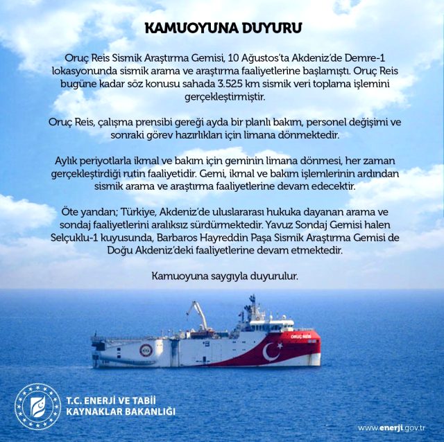 "Oruç Reis sismik araştırma gemisi, 10 Ağustos'ta Akdeniz'de Demre-1 lokasyonunda sismik arama ve araştırma faaliyetlerine başlamıştı. Oruç Reis bugüne kadar söz konusu sahada 3 bin 525 km sismik veri toplama işlemini gerçekleştirmiştir. Oruç Reis, çalışma prensibi gereği ayda bir planlı bakım, personel değişimi ve sonraki görev hazırlıkları için limana dönmektedir. Aylık periyotlarla ikmal ve bakım için geminin limana dönmesi, her zaman gerçekleştirdiği rutin bir faaliyettir. Gemi, ikmal ve bakım işlemlerinin ardından sismik arama ve araştırma faaliyetlerine devam edecektir.