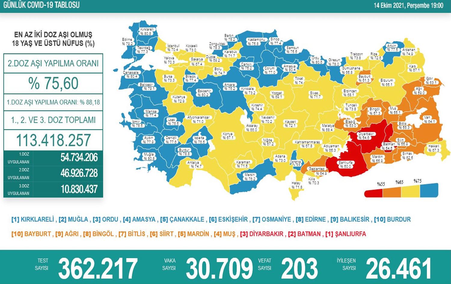 En az iki doz aşı yapılanların oranının en düşük olduğu iller ise Urfa, Batman, Diyarbakır, Muş, Mardin, Siirt, Bitlis, Bingöl, Ağrı ve Bayburt olarak sıralandı.