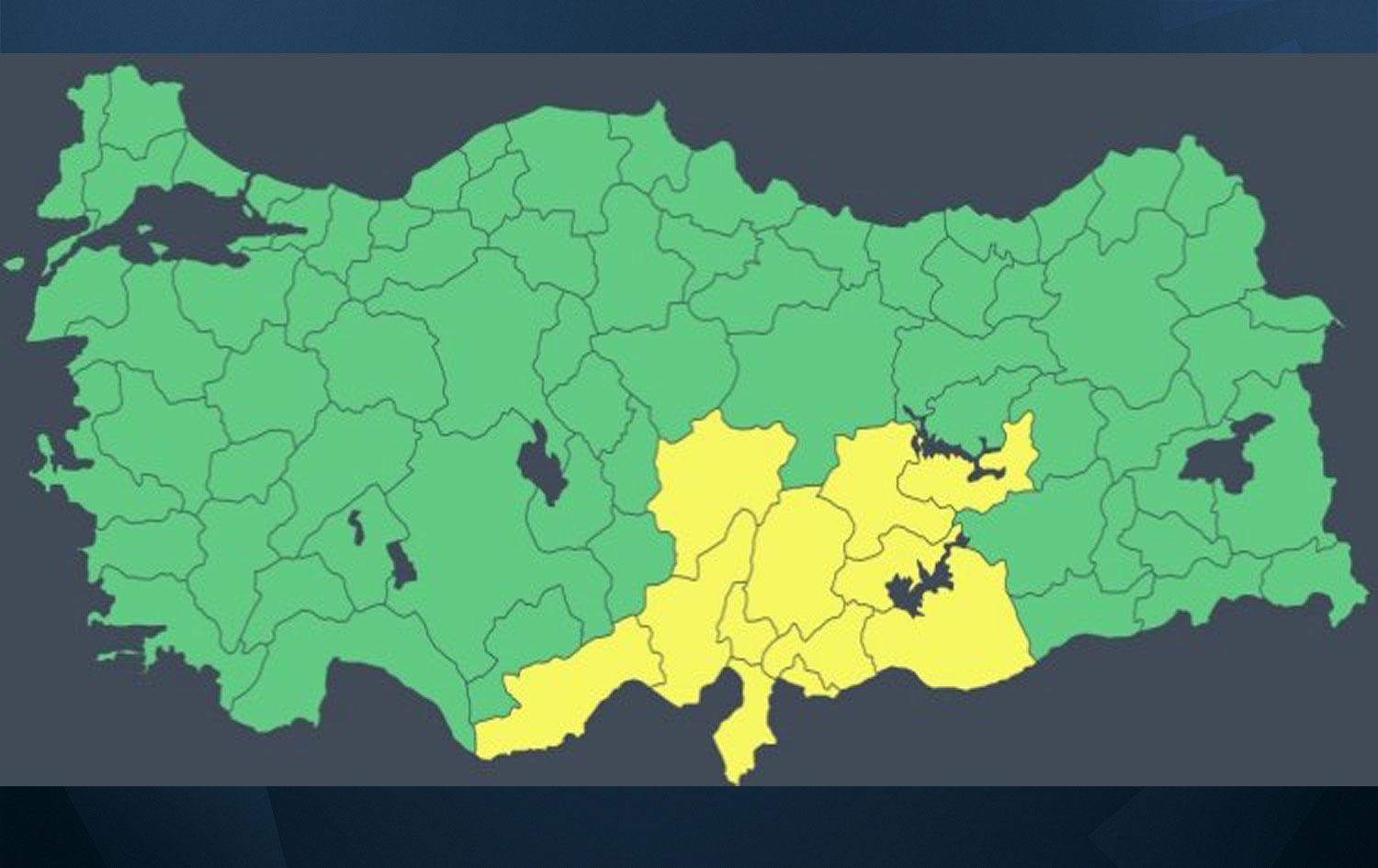 Kuvvetli yağış beklenen Mersin, Kayseri, yağış ve toz taşınımı beklenen Adana, Antep, Hatay, Malatya, Maraş, Osmaniye ile toz taşınımı beklenen Adıyaman, Elazığ ve Urfa için "sarı" kodlu uyarıda bulunuldu.
