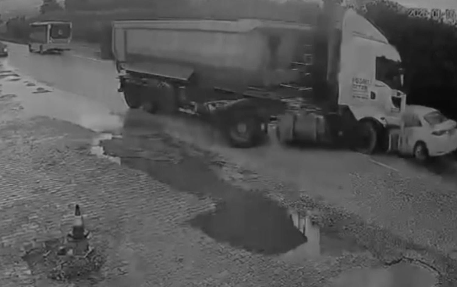 Görüntüde, seyir halindeki kamyonun kontrolden çıkarak, karşı yönden gelen otomobile çarpması yer alıyor.