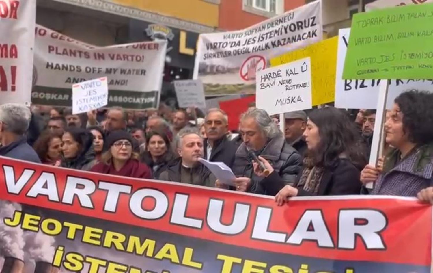 Açıklamada, “Vartolular JES istemiyor” pankartı açılırken, “Varto bizim, bizim kalacak”, “Küçük Paris’ime dokunma”, “Suyuma toprağıma dokunma” dövizleri taşındı.