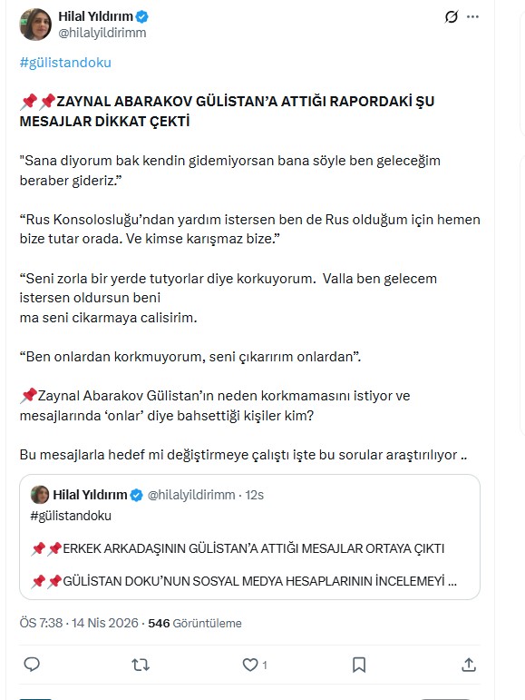 Haber Merkezi - Dersim'de 2020'de kaybolduktan sonra bir daha haber alınamayan Gülistan Doku olayında, erkek arkadaşı Zeinal Abakarov'un attığı mesajlar ortaya çıktı. Abakarov'un mesajlarda, "Valla ben bir şeyden korkmuyorum orada. Seni zorla bir yerde tutuyorlar diye korkuyorum. Gülistan korkma. Böyle bir şey varsa mesaj at. Ben geleceğim isterse öldürsün. Beni ama seni çıkarmaya çalışırım. Devlet de bir şey yapamaz" dediği iddia edildi. Ayrıca Doku’nun kaybolduktan 12 gün sonra Whatsapp ve Instagram hesaplarına girilerek mesajlarının silindiği ileri sürüldü.