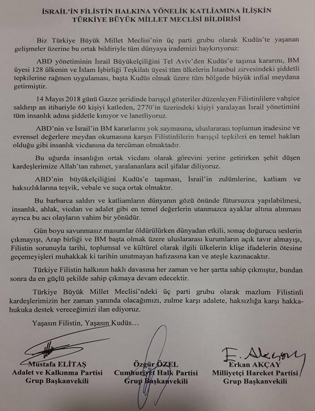 "İsrail yönetimini tüm insanlık adına şiddetle kınıyor ve lanetliyoruz. ABD'nin ve İsrail'in, BM kararlarını yok saymasına, uluslararası toplumun iradesine ve evrensel değerlerine meydan okumasına karşı Filistinlilerinin barışçıl tepkileri en temel hakları olduğu gibi insanlık vicdanına da tercüman olmaktadır."