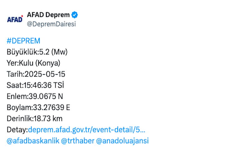 Haber Merkezi - Afet ve Acil Durum Yönetimi Başkanlığı (AFAD) verilerine göre, 15 Mayıs 2025 Çarşamba günü saat 15.46’da Konya’nın Kulu ilçesinde 5.2 büyüklüğünde bir deprem meydana geldi.