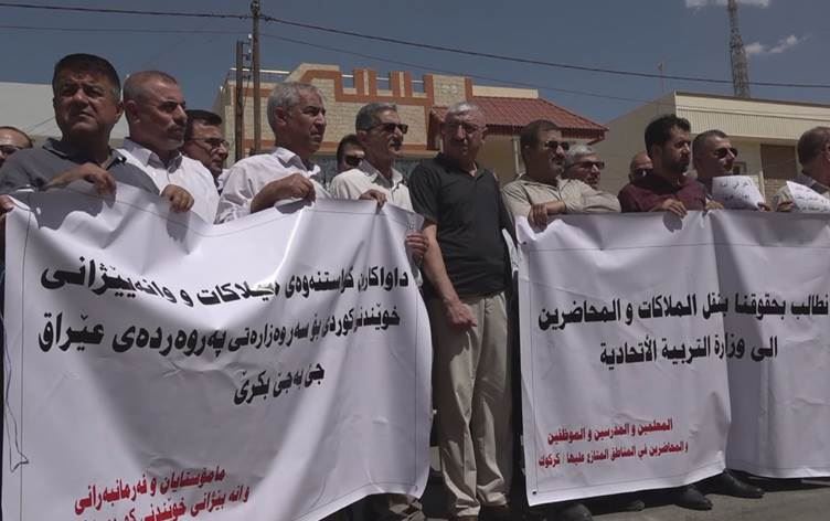 Kalabalık bir öğretmen grubu Kerkük'teki parlamento binası önünde protesto gösterisi düzenleyerek Irak hükümetine maaş bordrolarını Erbil'den Bağdat'a aktarması çağrısında bulundu.