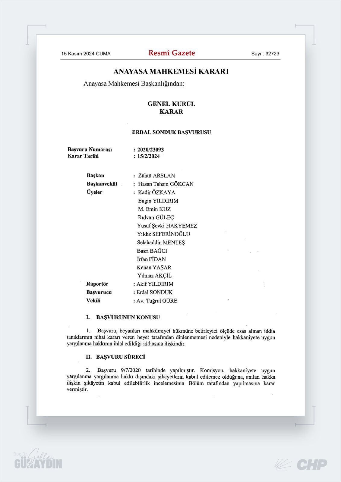 CHP Grup Başkanvekili Gökhan Günaydın kararı X hesabından paylaşarak, "Anayasa Mahkemesi, yargılama sırasında heyet değişikliğinin adil yargılanma hakkı ihlali oluşturduğuna karar verdi. İmamoğlu’na yönelik Ahmak Davası’nda hem ilk derece mahkemesinde hem de istinaf aşamasında heyet değiştirilmişti. 15 Şubat 2024 tarihinde verilen karar, 9 ay gecikmeyle 15 Kasım 2024 tarihinde Resmi Gazete’de yayımlandı. İhlal kararına dönemin AYM Başkanı Zühtü Arslan ile birlikte çoğunluk üye imza atarken, şimdiki başkan Kadir Özkaya’nın da aralarında bulunduğu 4 üyenin karşı oy yazmak suretiyle karara muhalif kaldıkları görüldü" dedi.