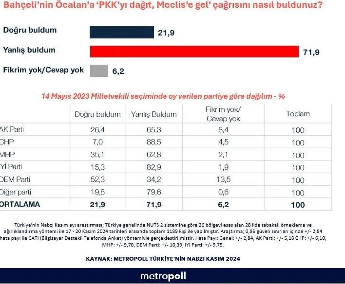 Bahçeli’nin çağrısına en büyük destek ise DEM Parti seçmeninden geldi. DEM Parti seçmeninin yüzde 52.3'ü çağrı için “doğru buldum” derken, yüzde 34.2 “yanlış buldum” cevabını verdi.
