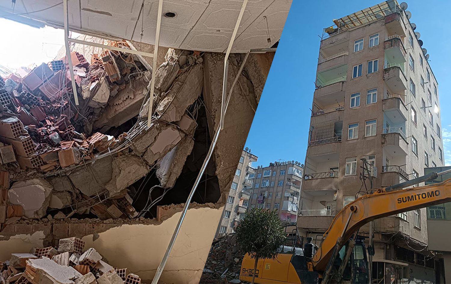 Amida Haber'in haberine göre; kepçe darbeleri ile devrilen Fidan Apartmanı, bitişiğindeki 7 katlı İpek Sevim Apartmanı’nın kolonları çöktü.