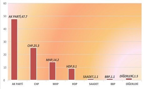 Ankette, kararsız oyların da dağıldığı takdirde, AK Parti yüzde 47'yi görürken, CHP yüzde 25.3, MHP yüzde 14.2, HDP ise yüzde 9.1 oranında oy alıyor.