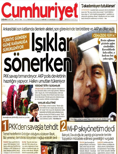 Cenaze törenine, yaşamını yitirenlerin yakınları, okul arkadaşları ve çok sayıda vatandaş katıldı. Törendeki CHP Grup Başkanvekili Levent Gök’ün yanısıra bazı milletvekilleri de katıldı. Cenazeler, Karşıyaka Mezarlığı’nda kılınan öğle ve ikindi namazlarının ardından defnedildi. Terör saldırısında yaşamını yitirenlerin cenaze töreninde AKP’ye öfke vardı. Elvin Buğra Arslan’ın annesinin feryadı yürekleri dağladı; “Benim oğlumun katili bir tane vampir!”