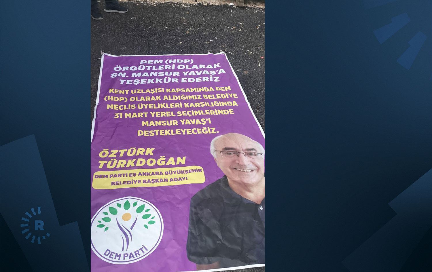 Hazırlanan sahte afişte DEM Parti'nin ABB Eş Başkan adayı Öztürk Türkdoğan'ın resmine yer verildi ve DEM Parti'nin seçimde Mansur Yavaş'a destek vereceği yazıldı.