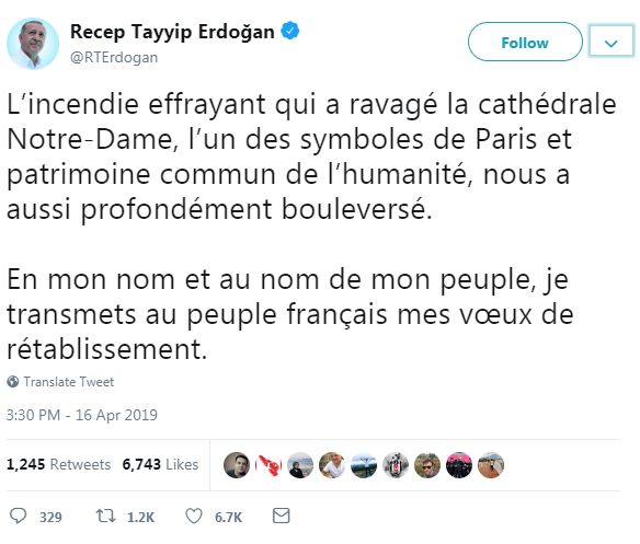 "Paris'in sembollerinden biri olan ve insanlığın ortak mirası Notre Dame Katedrali'ni tahrip eden korkunç yangın bizi de derinden sarstı. Kendim ve halkım adına, Fransız halkına geçmiş olsun dileklerimi iletiyorum."