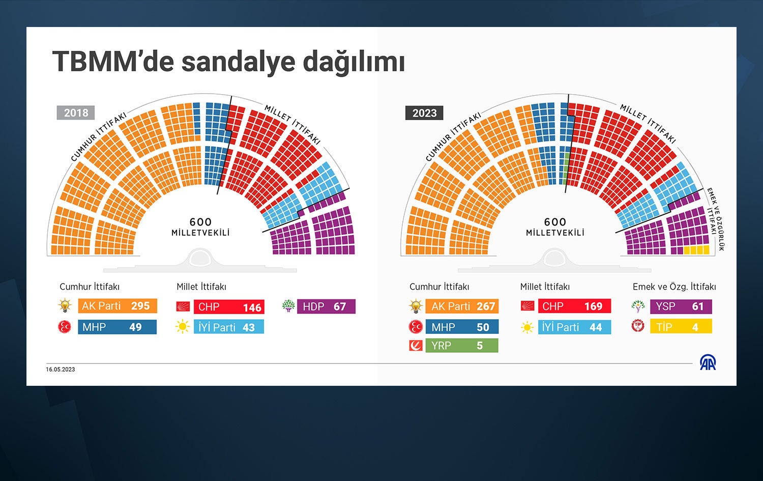 14 Mayıs’ta yapılan 28'inci Dönem Milletvekili Genel Seçimi'nin kesin olmayan sonuçlarına göre ittifakların sandalye dağılımı şöyle oldu: