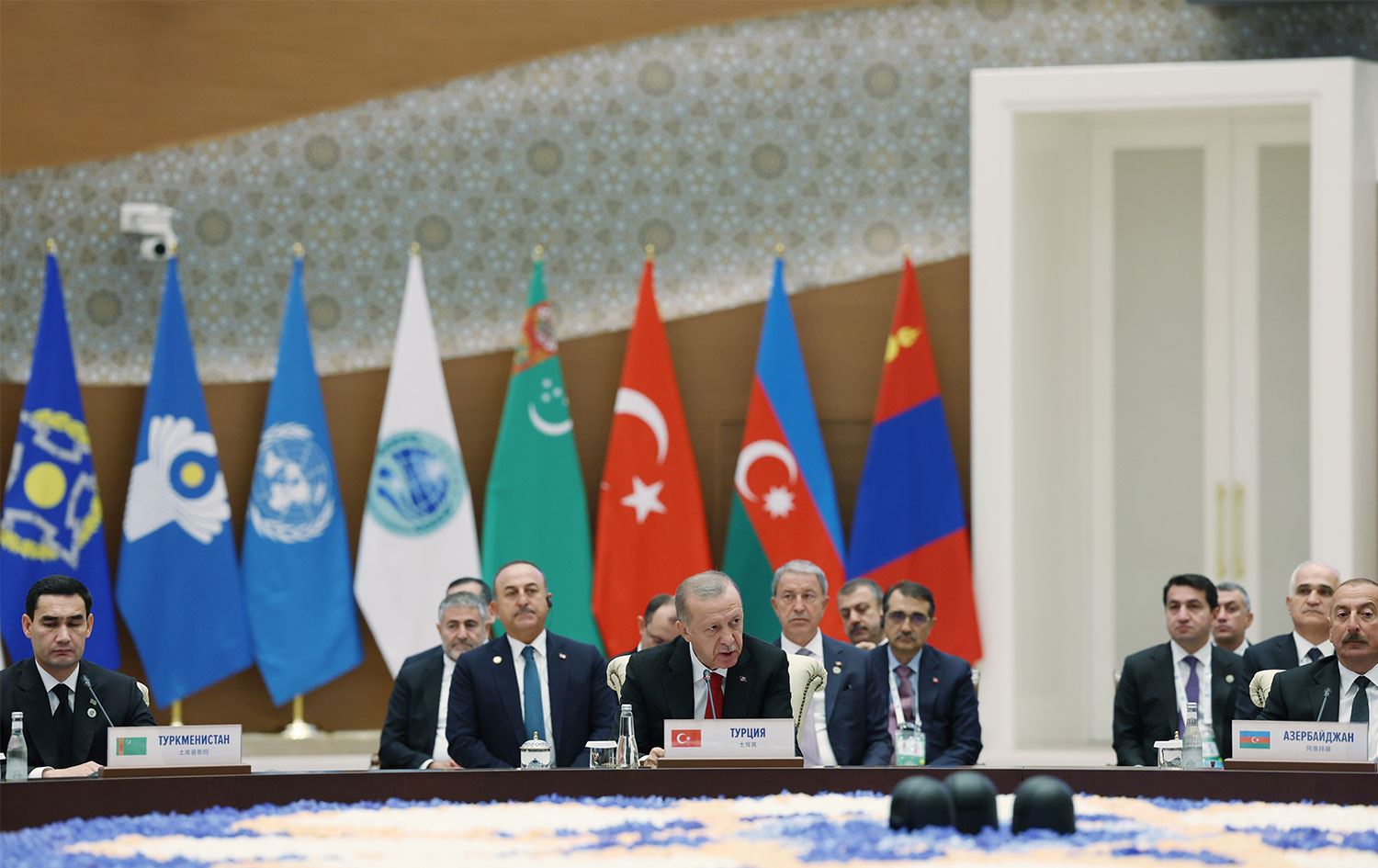 "Orta Koridor adını verdiğimiz girişimin Kafkaslar, Orta Asya ve Çin Halk Cumhuriyeti hattında mühim bir arter görevi gördüğü bölgemizde ve ötesinde refahın ve istikrarın tesisinde büyük rol oynadığı aşikardır. Türkiye son 20 yılda gerçekleştirdiği devasa ulaşım ve altyapı yatırımlarıyla bu alanda çok önemli bir başarıya imza atmıştır. Ülkemizin doğu ile batı arasındaki köprü konumu bizlere emsalsiz imkanlar sunmaktadır. Bu anlayışla güvenlikten ekonomiye, enerjiden ulaşıma, tarımdan turizme kadar her alanda iş birliğine hazırız. ŞİÖ içinde devam eden siyasi ve ekonomik süreçlere de katkı sağlamaya devam edeceğiz. Teşkilat üyesi ülkelerin ekonomik ve insani kalkınmalarından temel hak ve hürriyetlerin geliştirilmesine kadar her konudaki çabalarını yakından takip etmeyi ve iş birliği yapmayı sürdüreceğiz."