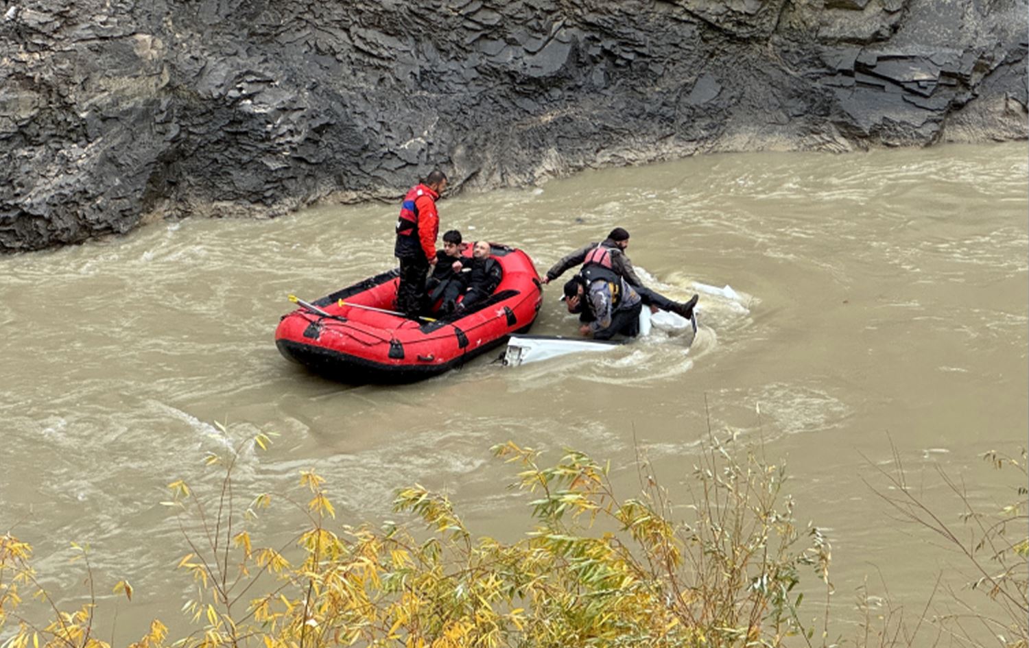 Suya indirilen botla araca ulaşan ekipler, AFAD gönüllüsü rafting antrenörleri Ramazan İlhan ve Selçuk Tunç'un da desteğiyle arka camı kırarak araçtaki 2 kişiyi yaralı kurtardı.