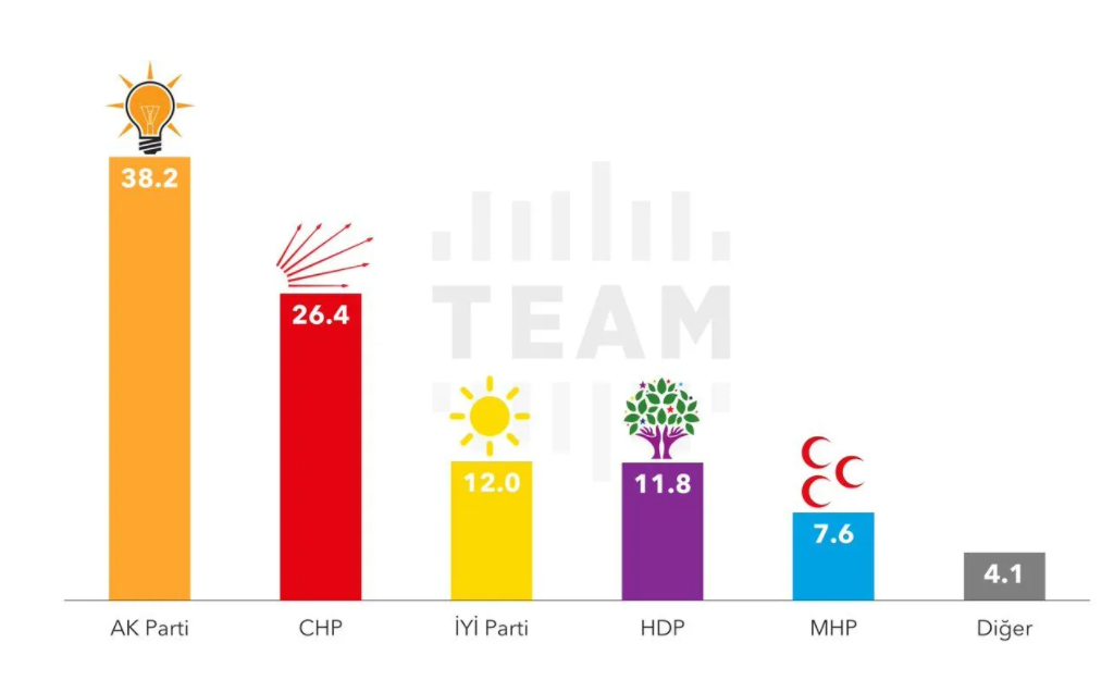 TEAM Araştırma, hazırladığı anketin sonuçlarını da paylaştı. Merkez, araştırmayla ilgili, "Geçen hafta tamamladığımız araştırmamızın seçmen tercihleri verilerini aşağıda bulabilirsiniz. Araştırma, Adana, Ankara, Balıkesir, Bursa, Diyarbakır, Erzurum, İstanbul, İzmir, Kayseri, Samsun, Trabzon ve Van'da yüz yüze görüşmeler ile gerçekleştirildi (Örneklem: 1594 kişi)" ifadelerini kullandı.