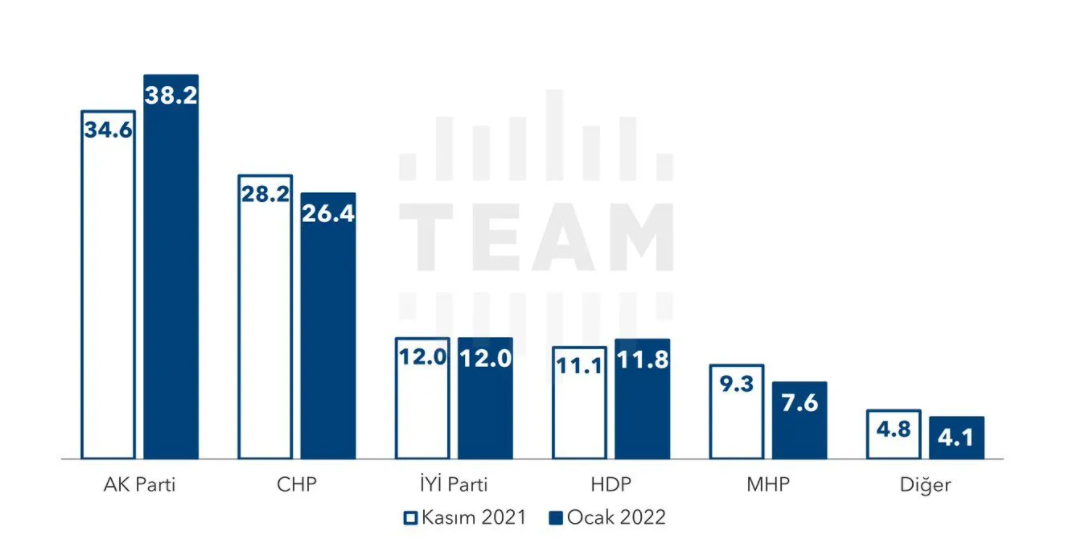 TEAM tarafından yapılan araştırmaya göre kararsızlar dağıtılmadan oy dağılımlarına bakıldığında, AK Parti'nin oylarının Kasım ayına göre 4.3 puan artırarak yüzde 32.1'e çıktığı, bu oyların yaklaşık 1 puanının MHP'den, kalanının da büyük oranda kararsızlardan geldiği görüldü.