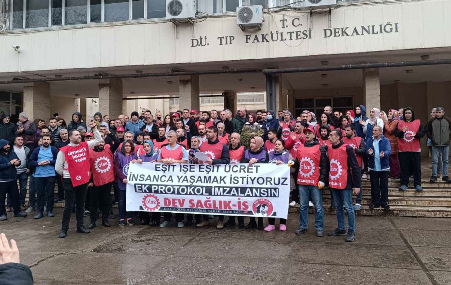 Sendika üyeleri Diyarbakır’da Dicle Üniversitesi Tıp Fakültesi Dekanlığı önünde basın açıklamasında bulundu.