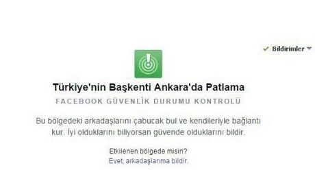 Haber Merkezi - Sosyal paylaşım sitesi Facebook, saldırı sonrasında Ankara'daki kullanıcılarının güvende olduklarını arkadaşlarına duyurabilmeleri için Güvenlik Durumu Kontrolü (Facebook Safety Check) uygulamasını devreye soktu.