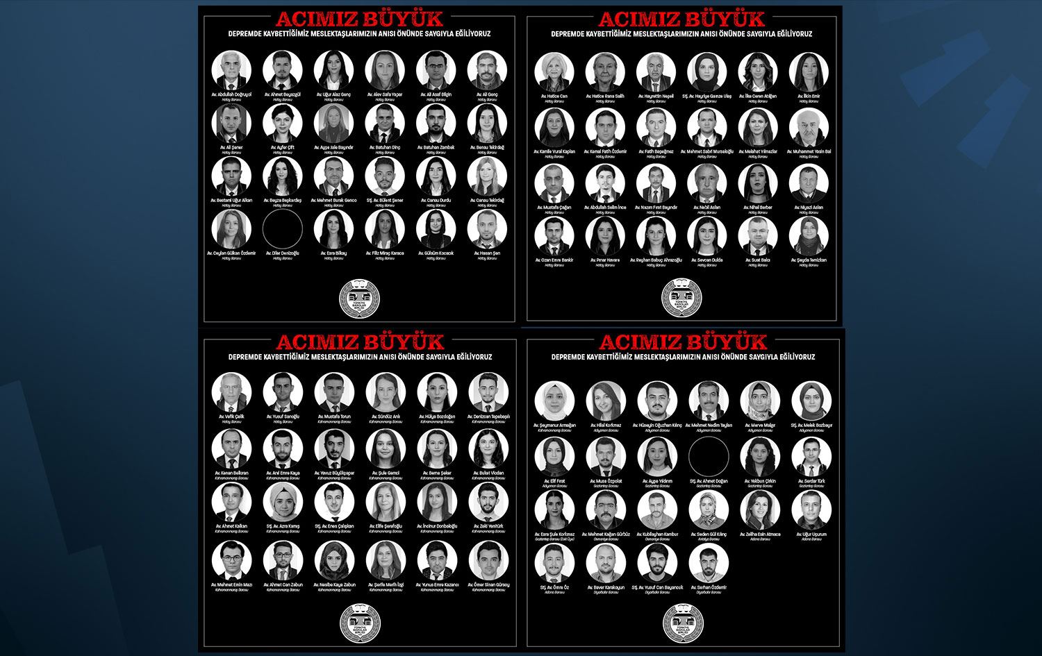 “Ülkemizi yasa boğan ve on bir ilimizde, on binlerce yurttaşımızın yaşamını yitirmesine neden olan 6 Şubat 2023 tarihli iki depremde, Birliğimize şu ana kadar ulaşan bilgilere göre 96 avukat ve stajyer avukat yaşamını yitirmiştir. 10 meslektaşımızdan ise haber alınamamış, göçük altında olabilecekleri öğrenilmiştir.